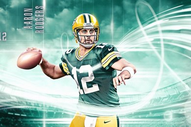 Description: A football player is holding a football in his hand and a green and yellow uniform is on the background.