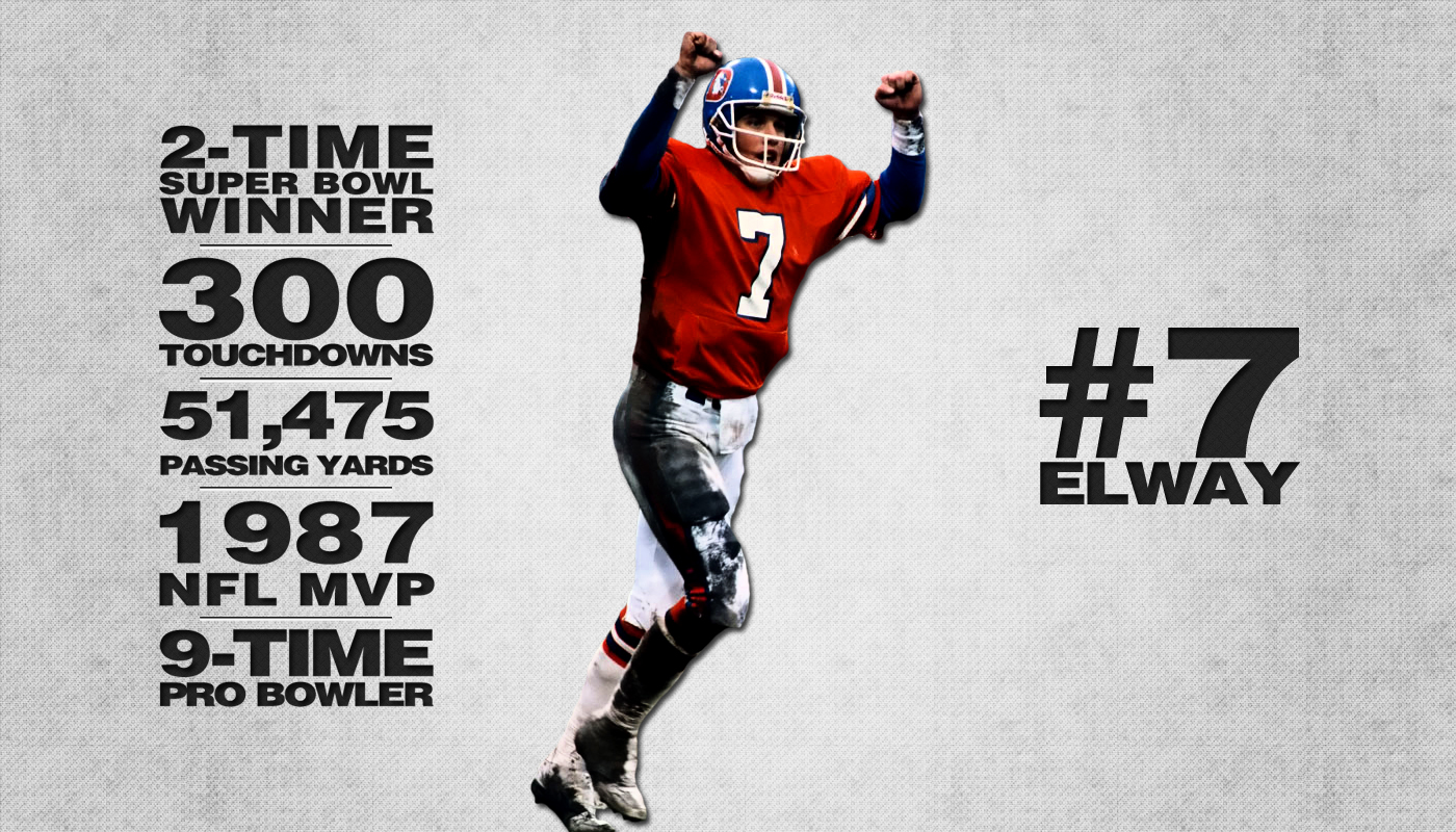 Description: A football player is jumping in the air with his arms in the air and numbers in the background that read 7 - time super bowl winner.