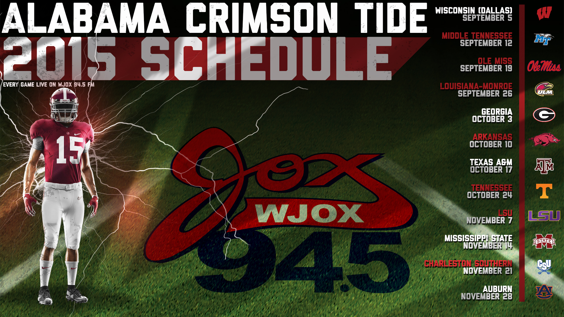 Description: A graphic of a football player in uniform with a lightning bolt in the background and the words.