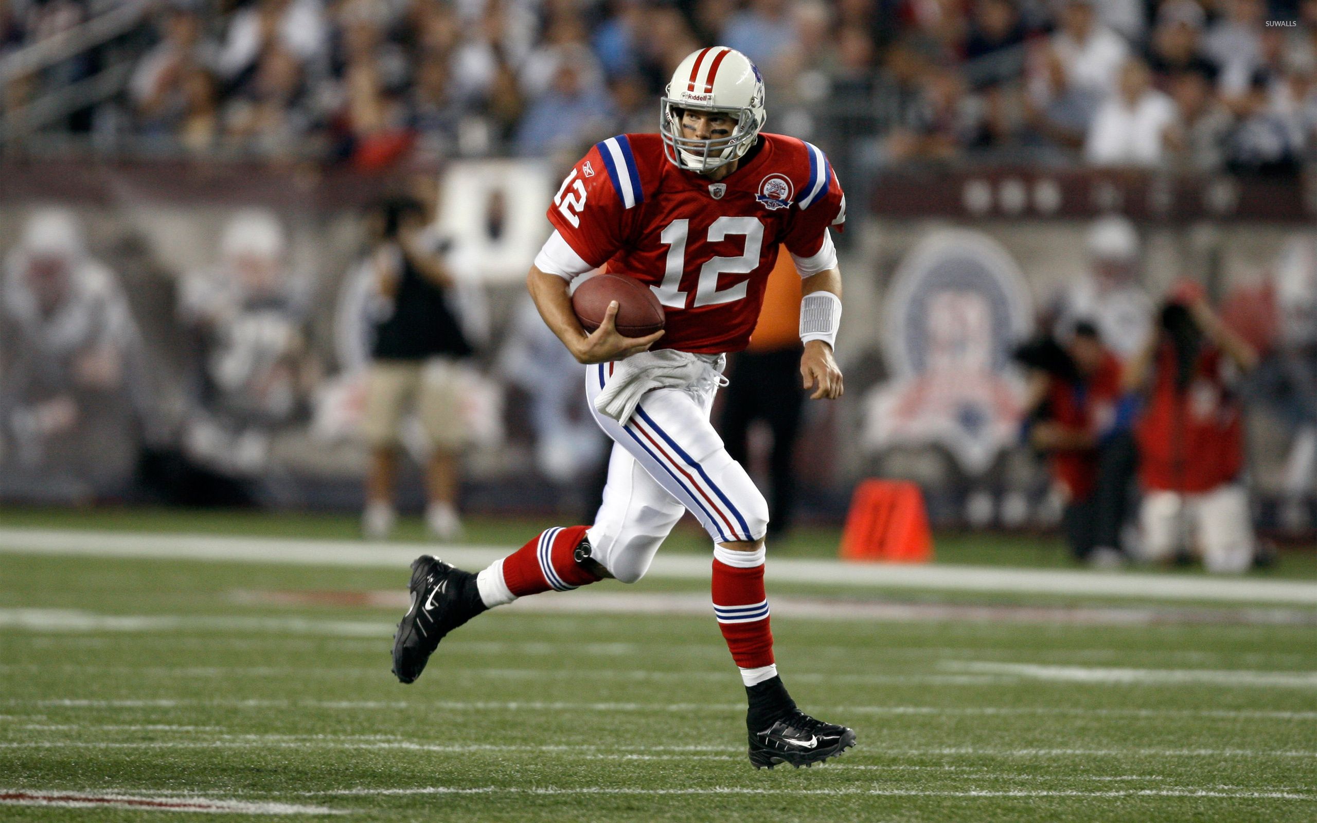 Description: A football player running with a ball in his hand and a crowd watching him from the sidelines watching him.