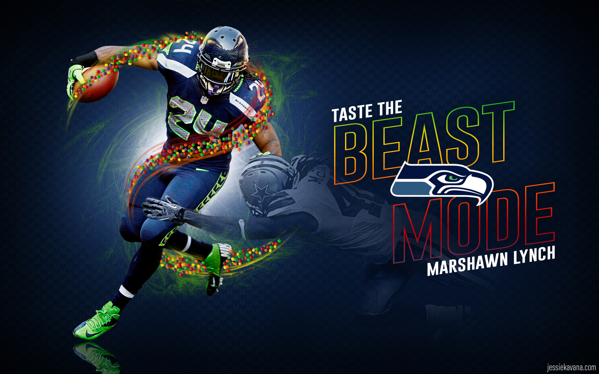 Description: A football player is running with a ball in his hand and the words taste the beast mode on the side.