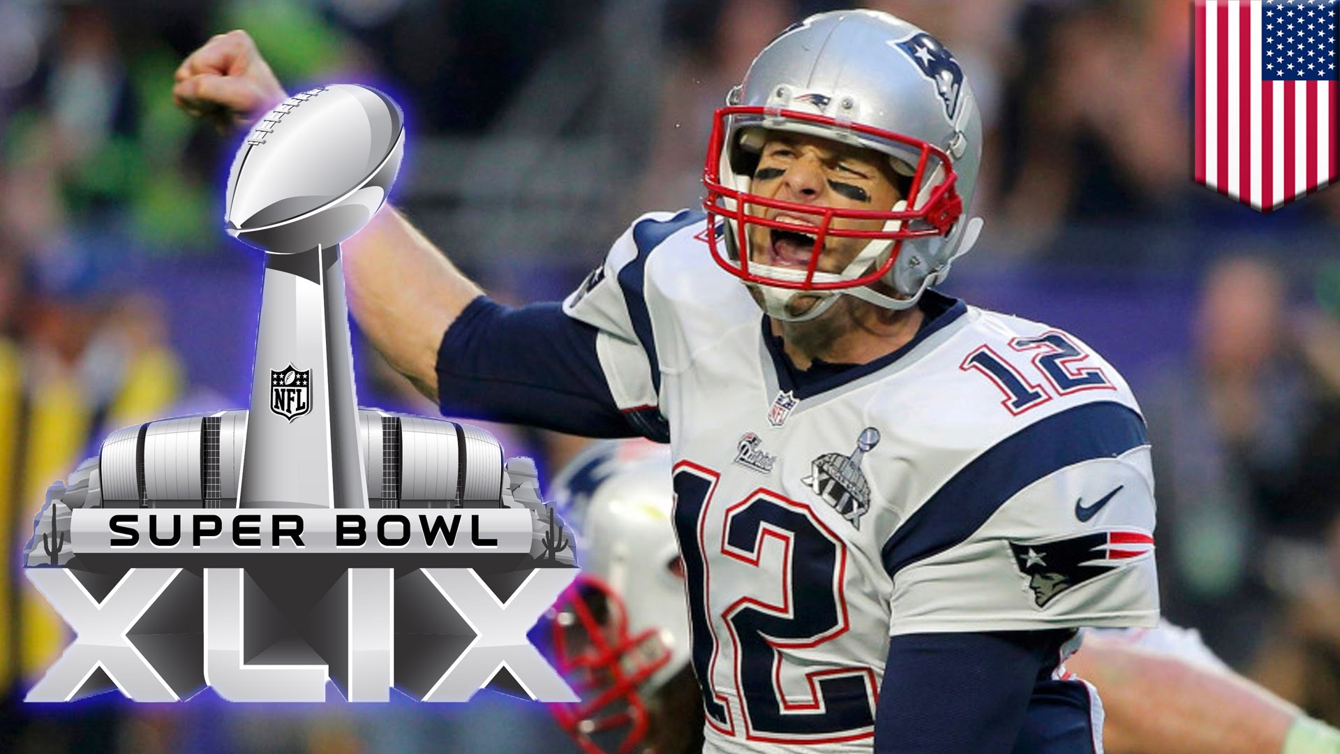 Description: A football player holding a football in his right hand and a super bowl trophy in the background with the words super bowl xxii.