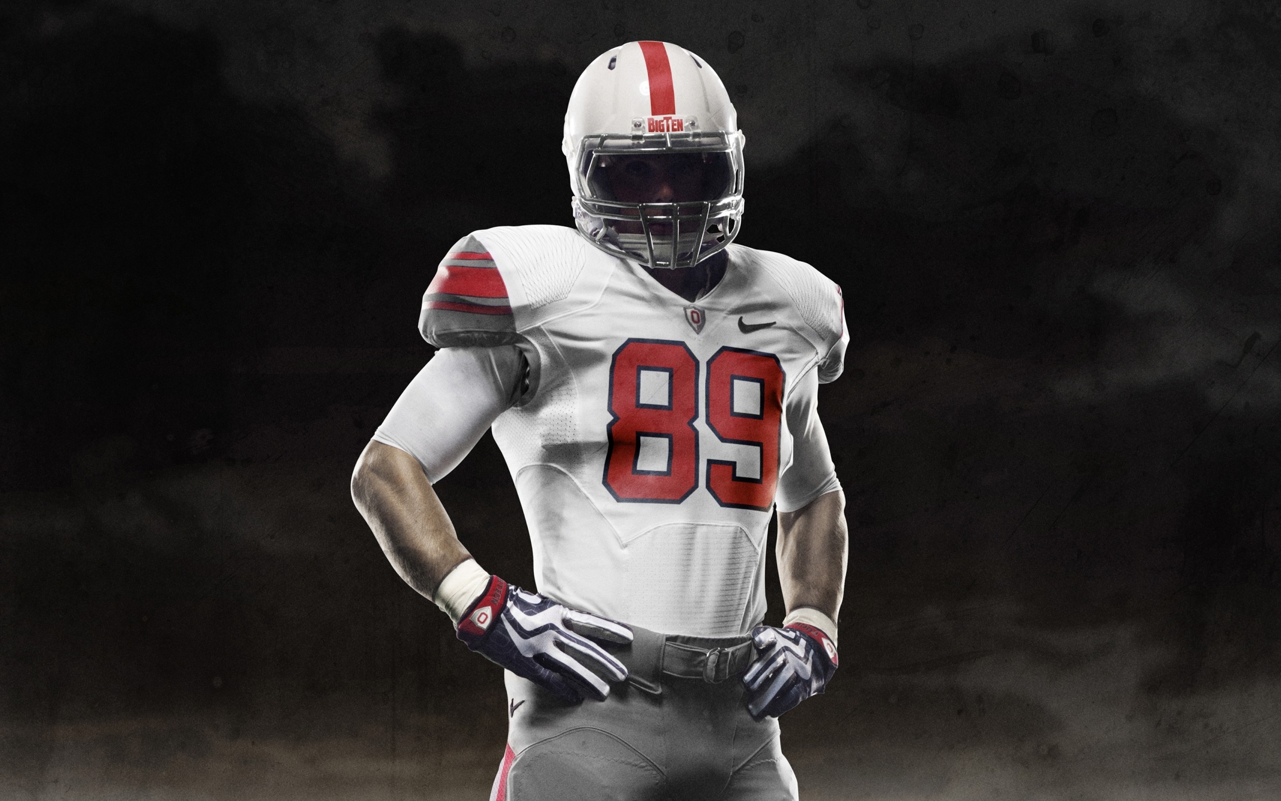 Description: A football player in a white uniform with a red and white number on his uniform and a black background.