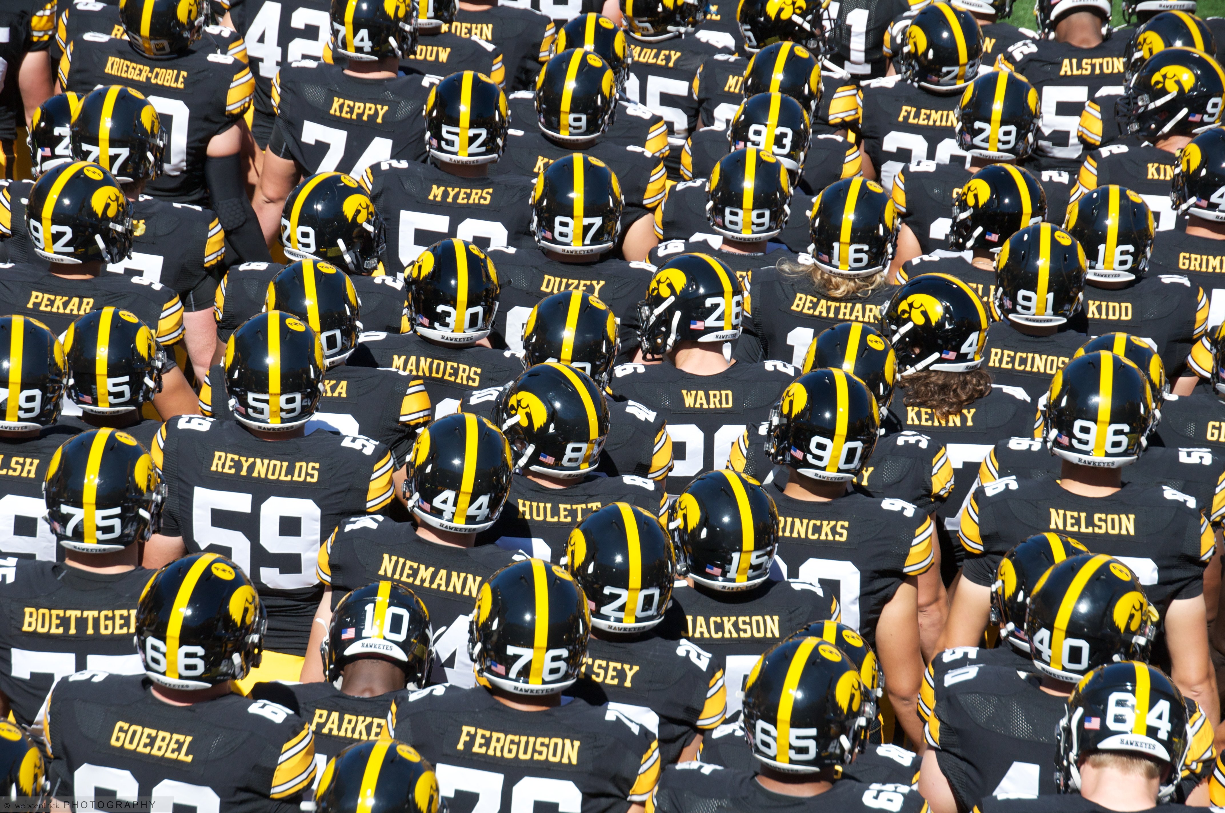Description: A large group of football players in black and yellow uniforms with numbers on them and numbers on their helmets.