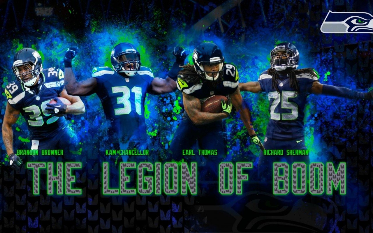 Description: A group of football players with the words the legend of boom on them in front of a background of blue and green.
