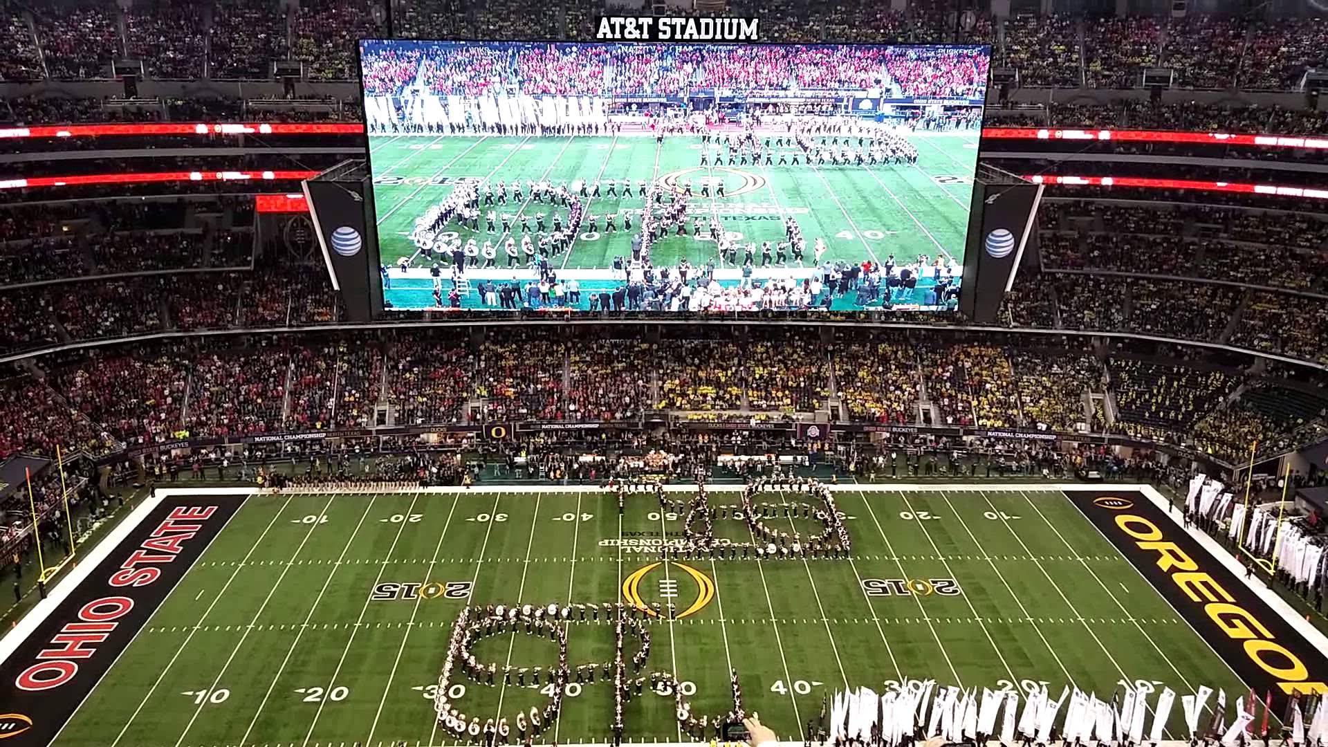 Description: A football stadium filled with lots of people watching a game on a big screen tv screen with a band on it.