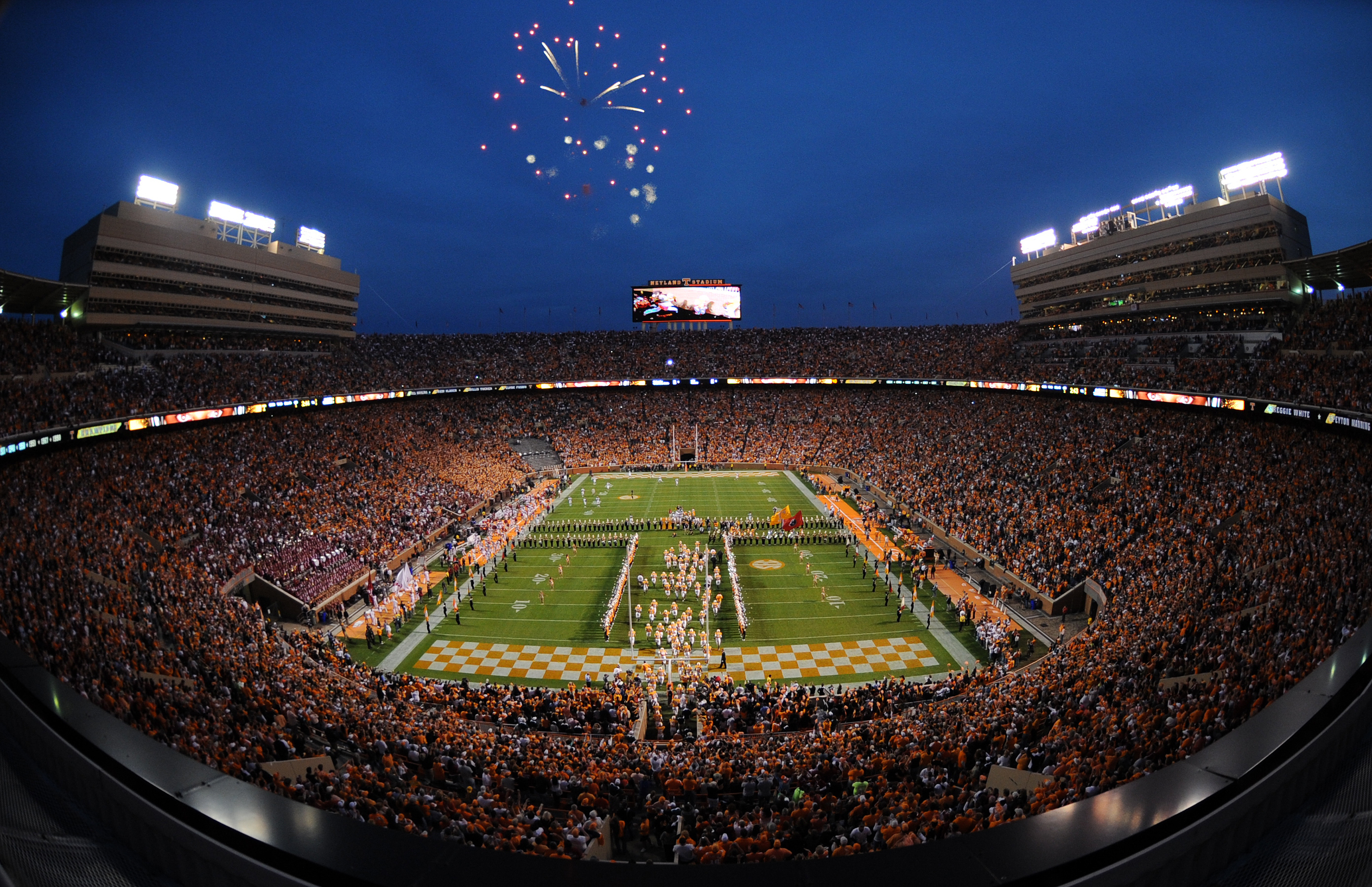 Description: A football stadium filled with lots of people watching fireworks go off in the sky above the field and on the field.