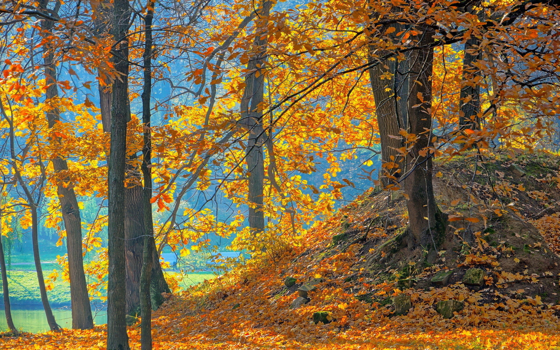 Description: A painting of a forest with yellow leaves on the ground and a hill in the background with a blue sky.