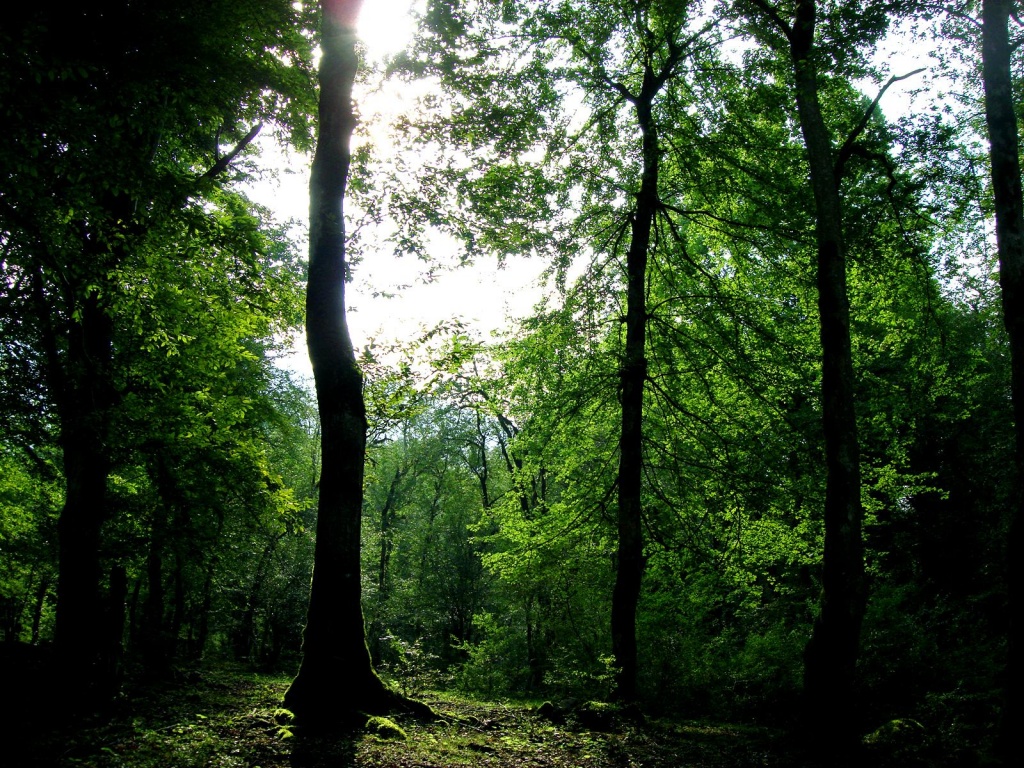 Description: A forest with lots of trees and a bench in the middle of it with the sun shining through the trees.