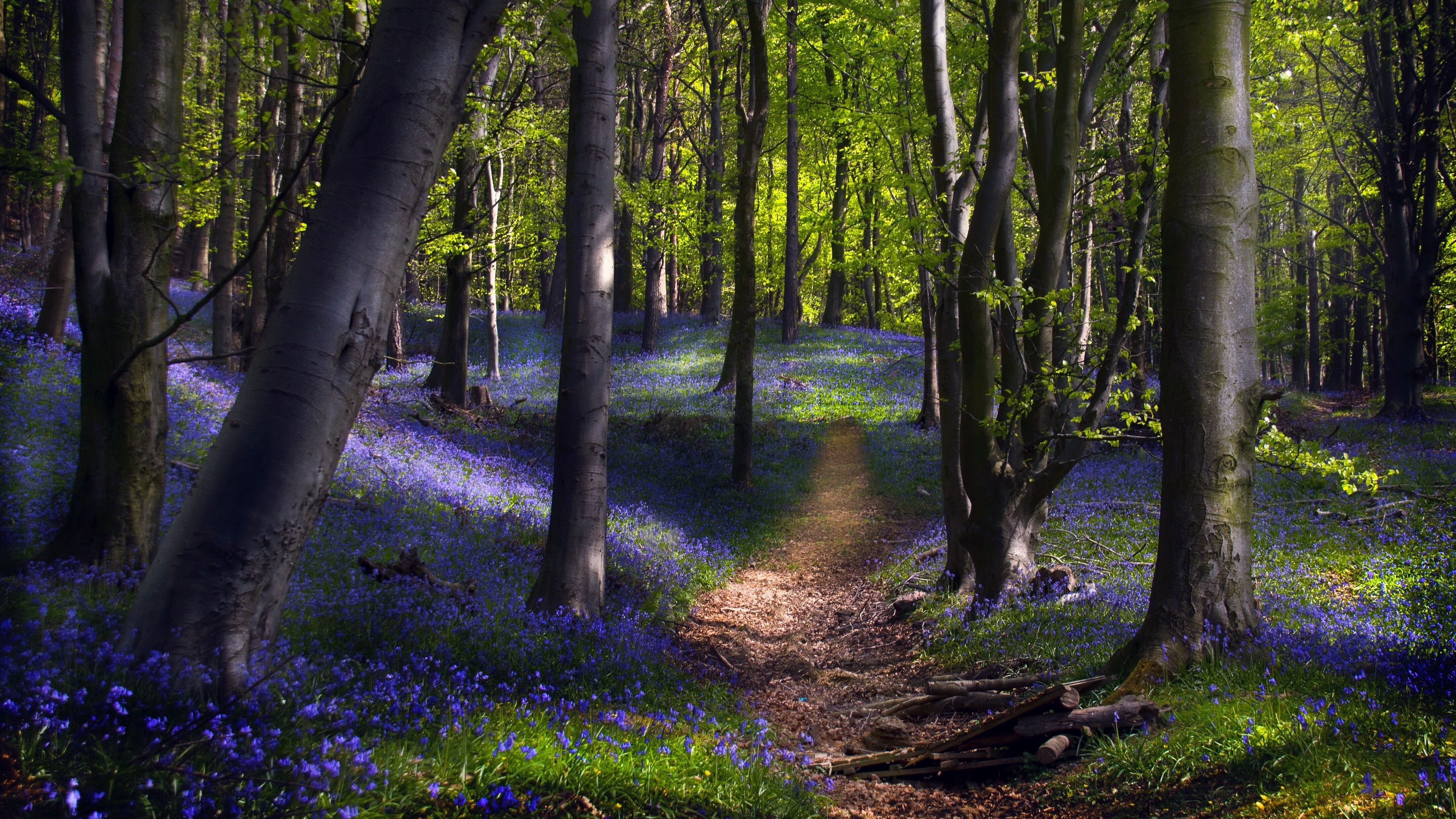 Description: A path through a forest with bluebells and trees in blooming colors on the ground and in the trees.