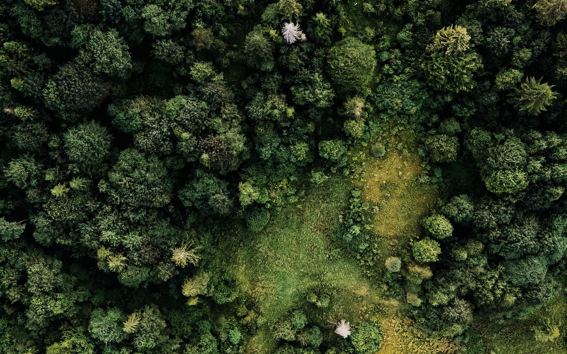 Description: A view of a forest from above with trees and grass in the foreground and a few white objects in the middle.