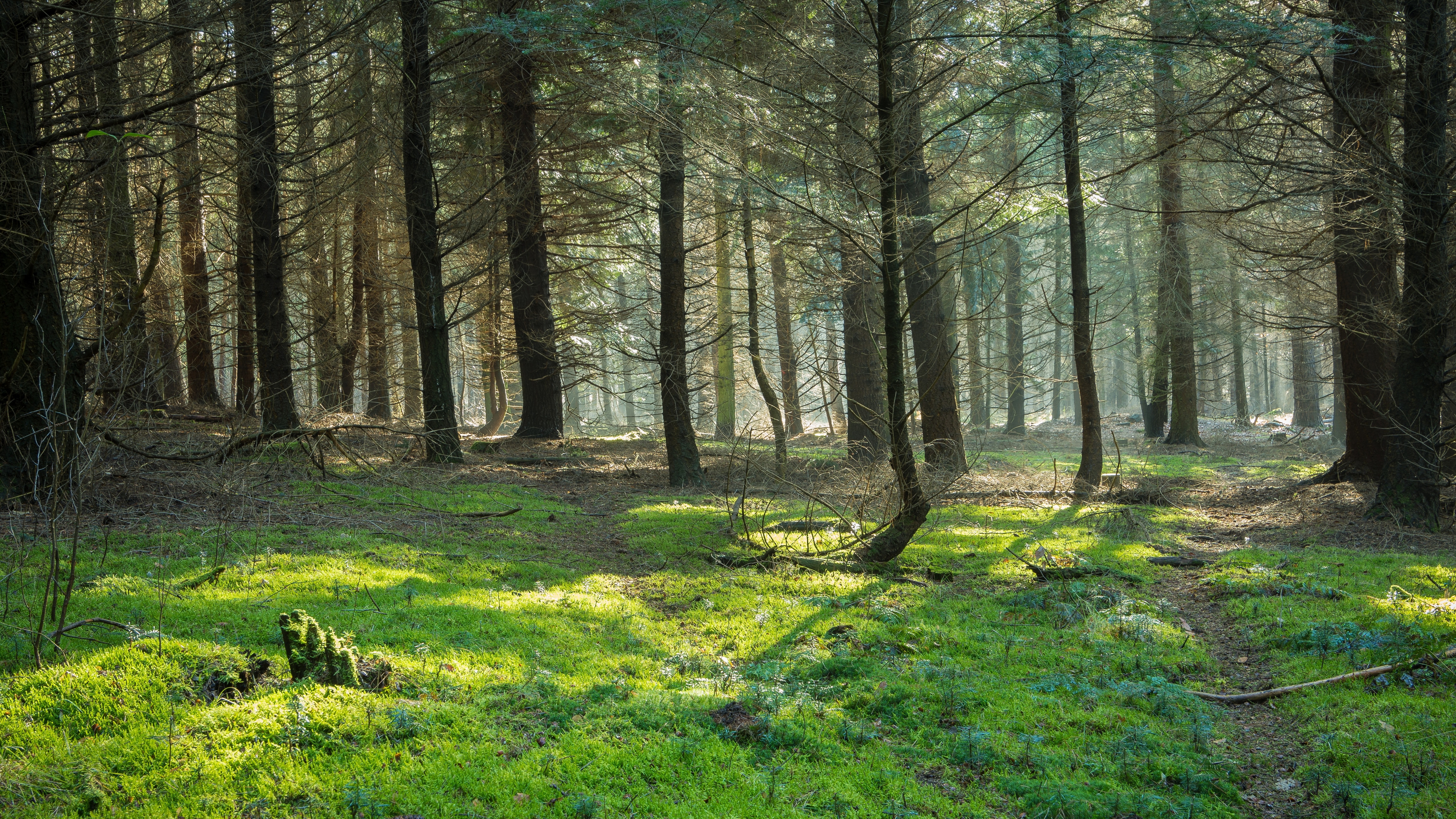 Description: A forest with lots of trees and grass on the ground and a few bushes on the ground and a few trees.