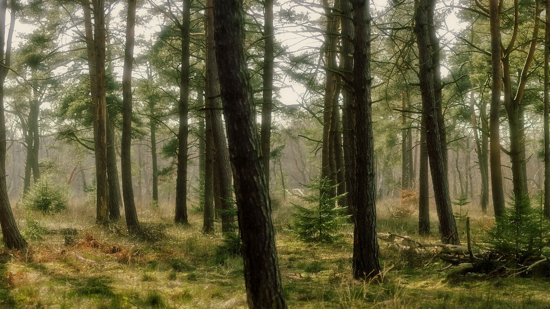 Description: A forest with lots of trees and grass on the ground and a few bushes on the ground and one tree in the middle.