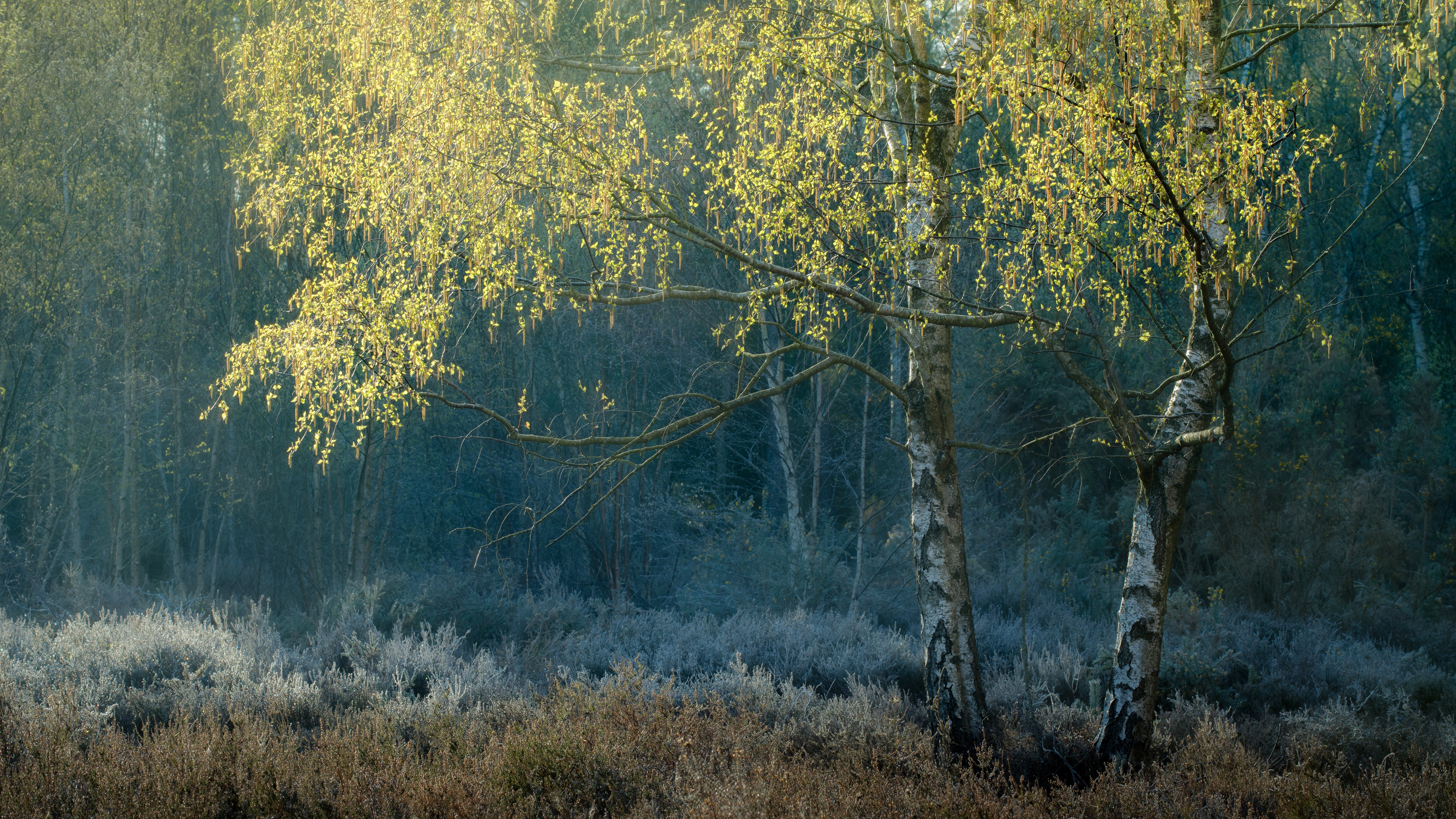 Description: A forest with a few trees and some bushes in the foreground and a few bushes in the background.