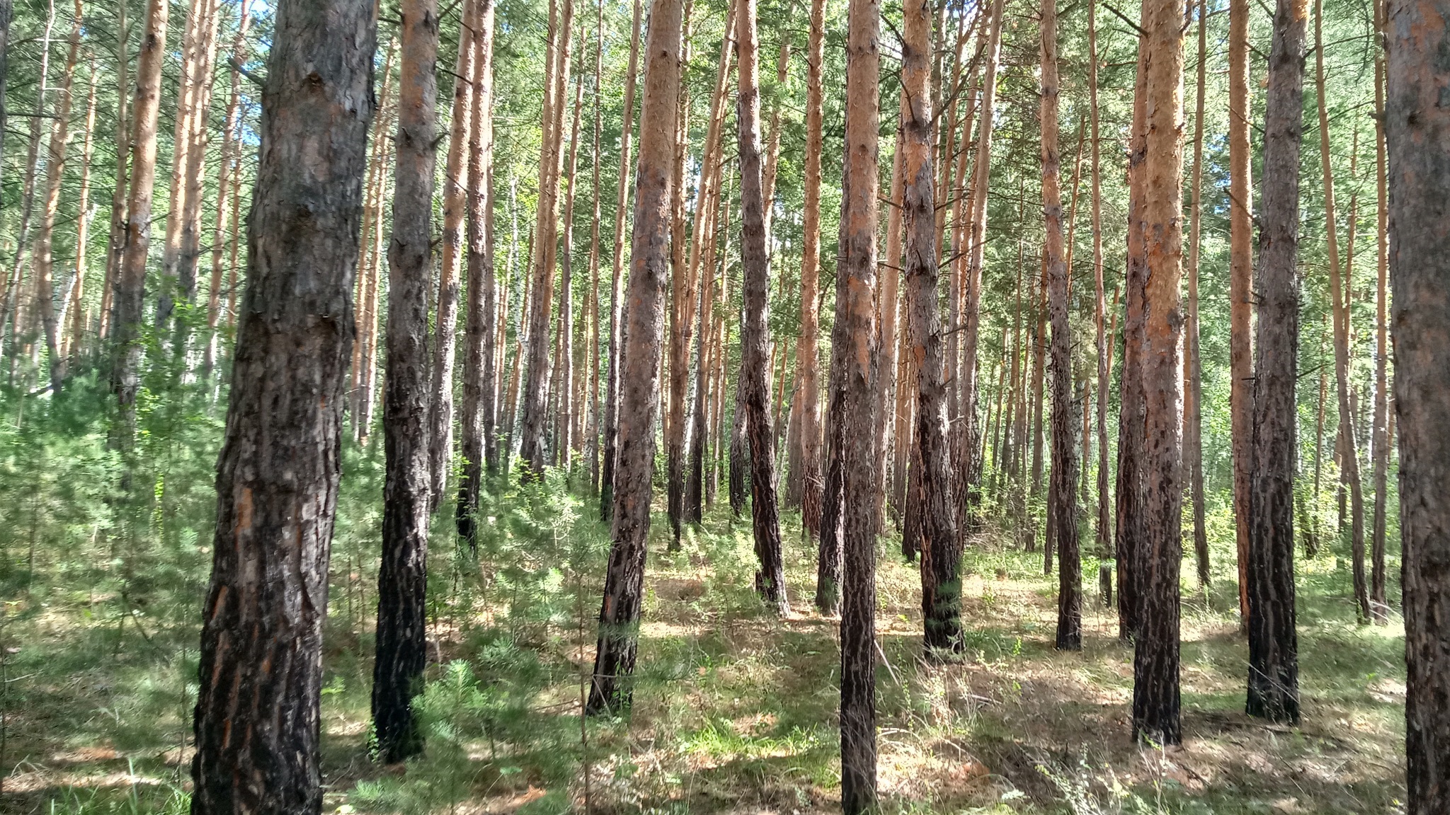 Description: A forest filled with lots of tall trees next to a forest floor covered in grass and trees with no leaves.