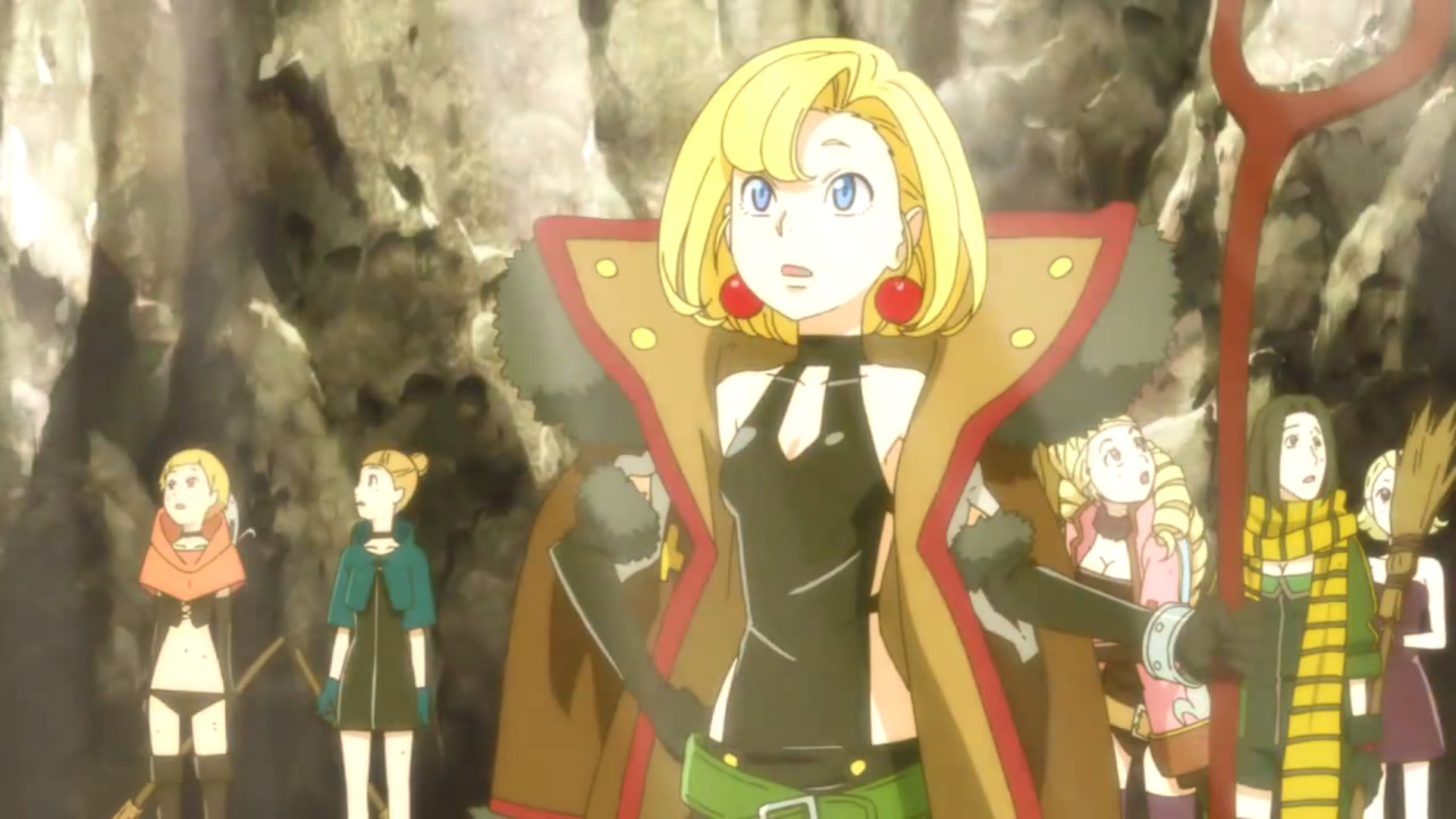 Description: A group of people standing around a giant chair in a forest with a woman in a black top and a man in a green suit.