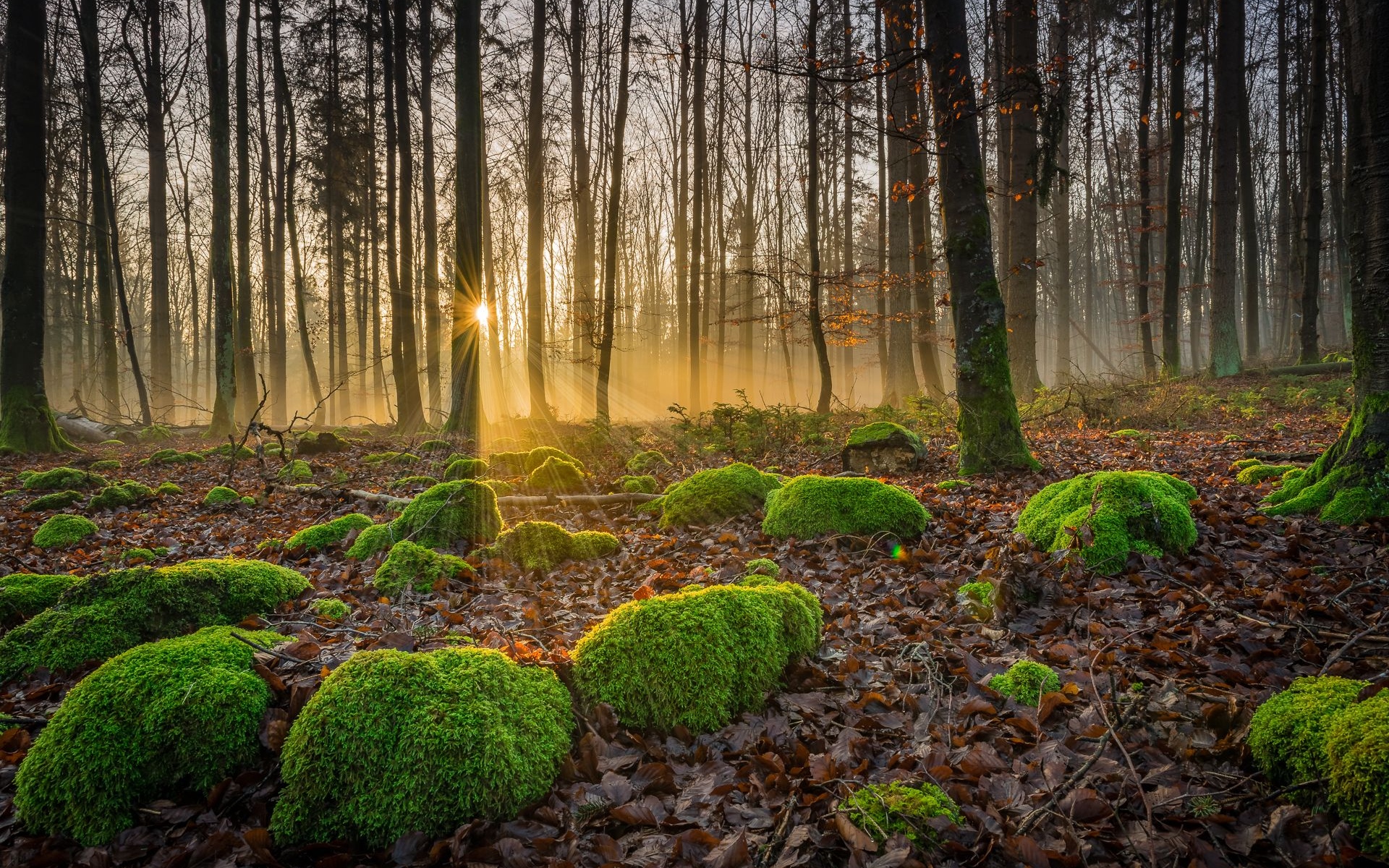 Description: A forest with moss covered rocks and trees in the background at sunset or dawn with a beam of light coming through the trees.