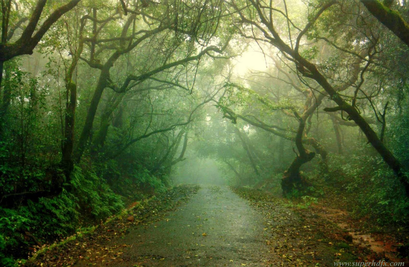 Description: A path in the middle of a forest with trees and leaves on the ground and fog in the air.