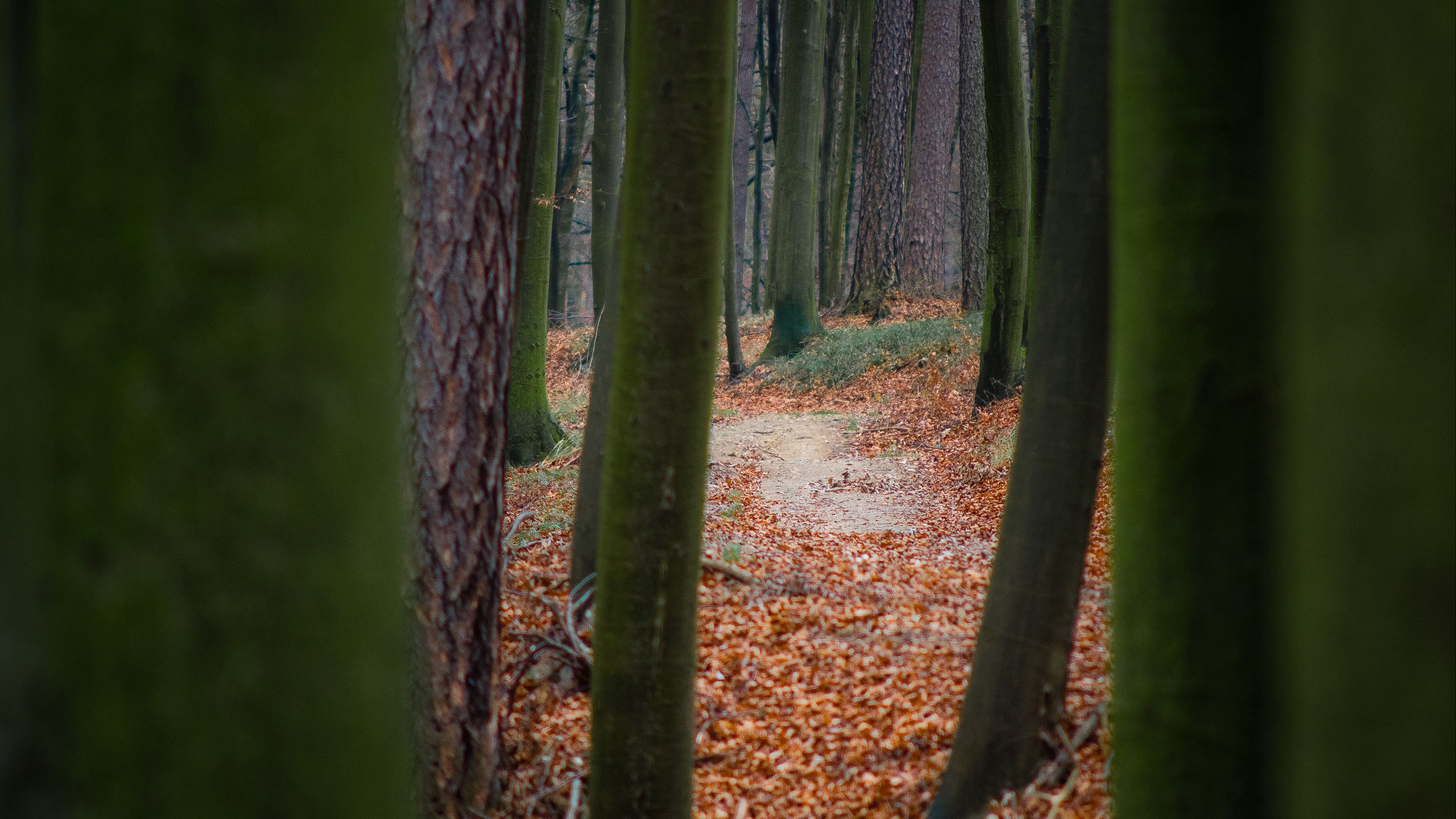 Description: A path in the woods with leaves on the ground and trees in the background with a path in the woods.