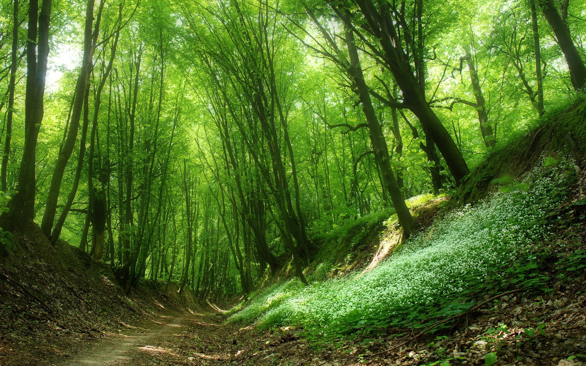 Description: A dirt path in a green forest with lots of trees on both sides of it and a dirt path leading up to the top of the path.