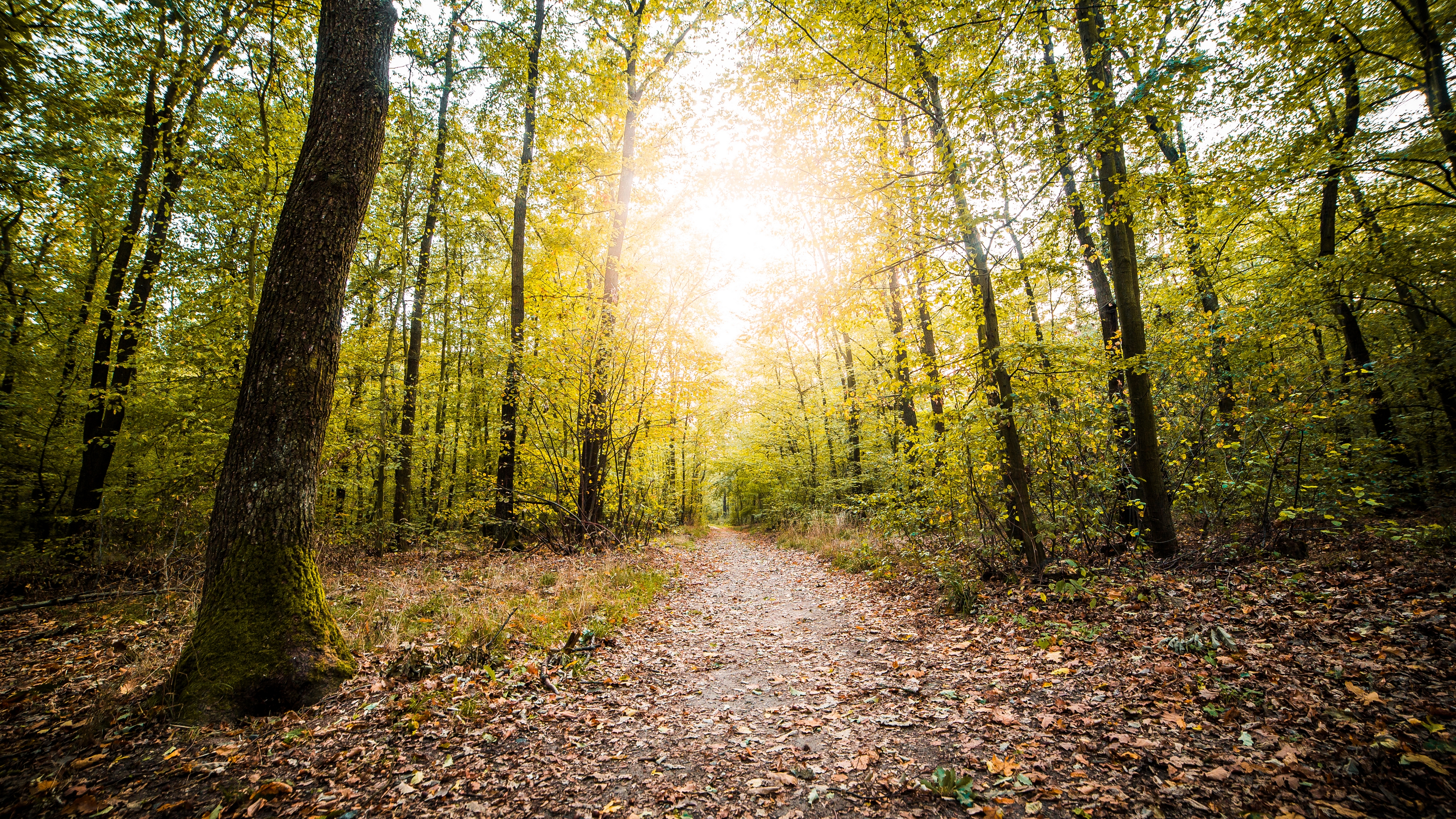 Description: A path in the middle of a forest with trees and leaves on the ground and the sun shining through the trees.