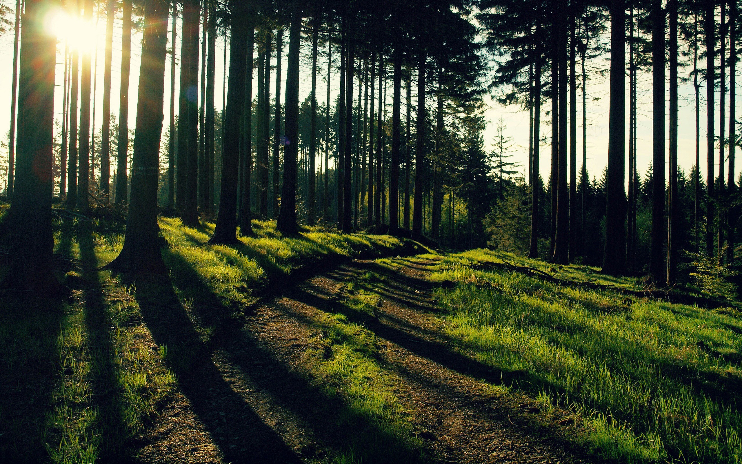 Description: A path in the middle of a forest with sun shining through the trees and grass on the ground and on the ground.