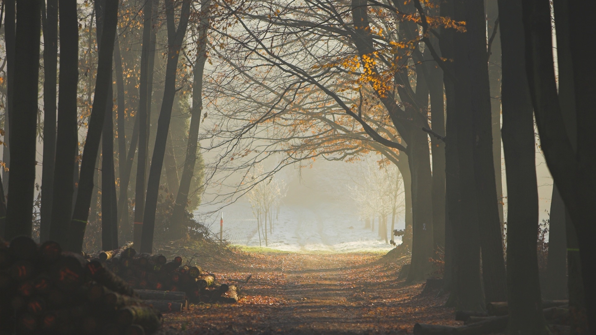 Description: A path in a forest with lots of trees and leaves on the ground and fog in the air and a bench on the side.