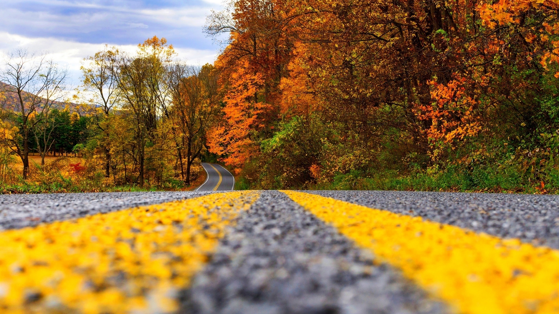Description: A road with a yellow line painted on it in the middle of a forest with trees in the background.