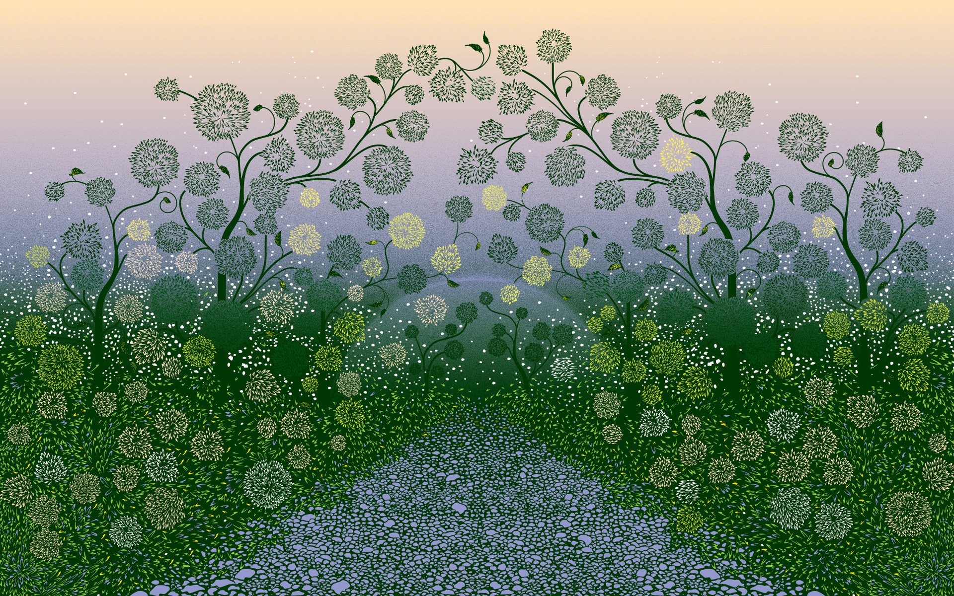 Description: A painting of a forest with a road going through it and lots of trees in the distance with a yellow sky.