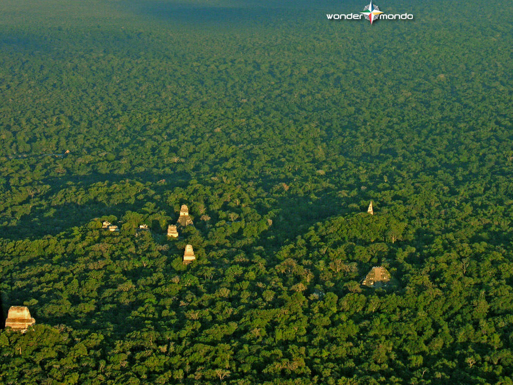 Description: A large area of trees with a sky background and a plane flying over it in the air above the trees.