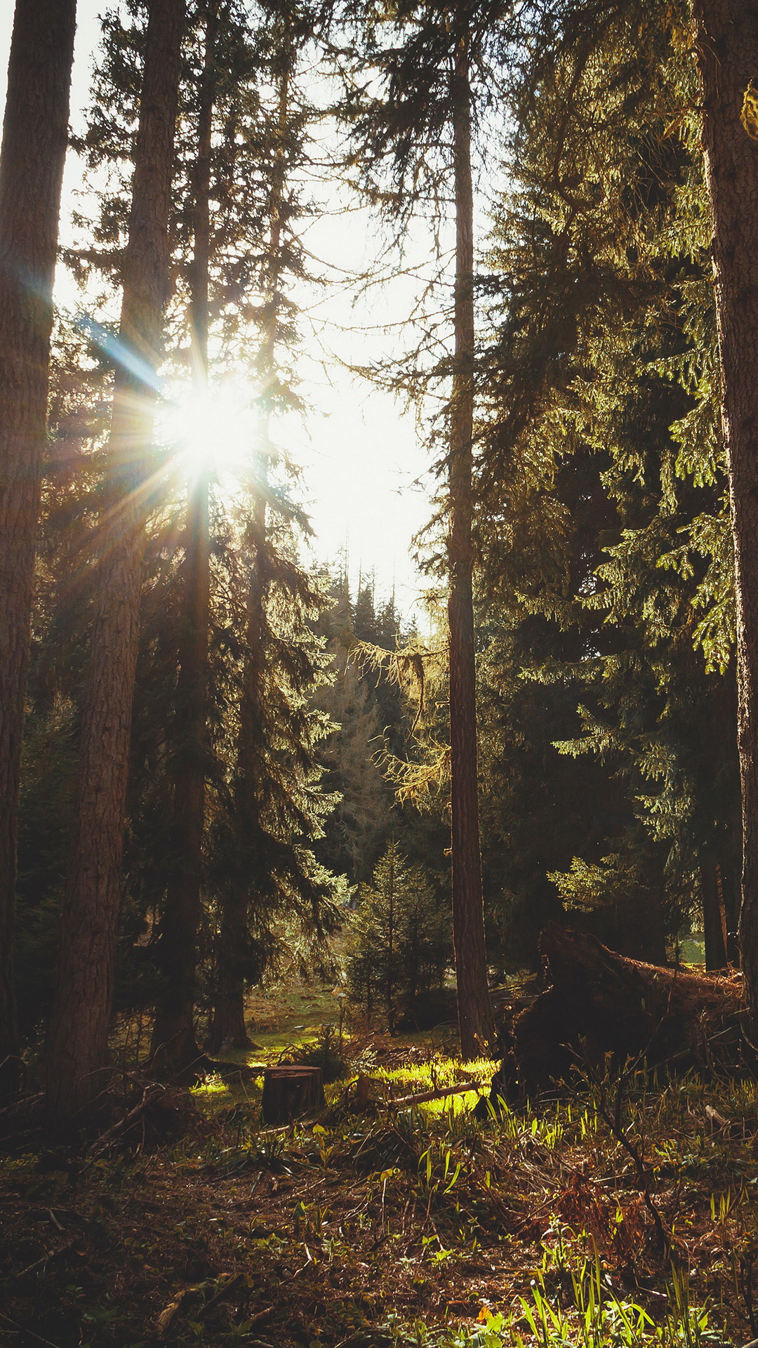 Description: A forest with a sun shining through the trees and a fallen tree trunk in the foreground with a sunbeam in the background.
