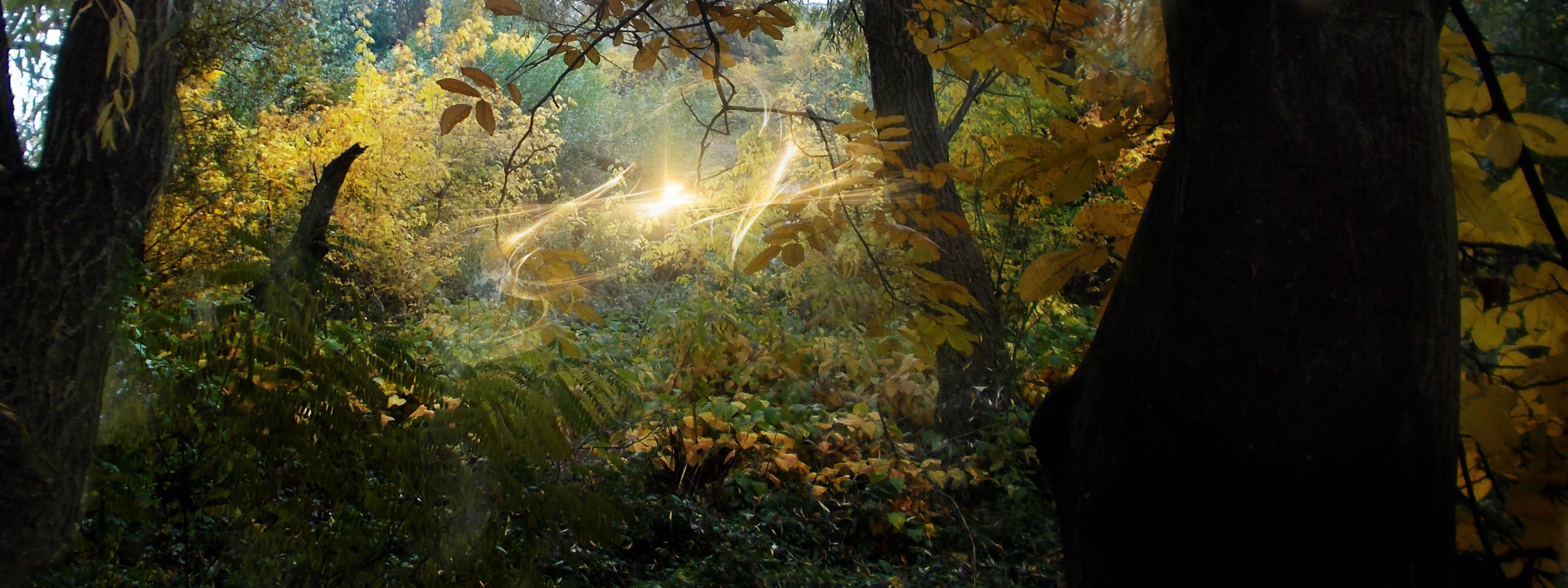 Description: A painting of a forest with sun shining through the trees and leaves on the ground and on the ground.