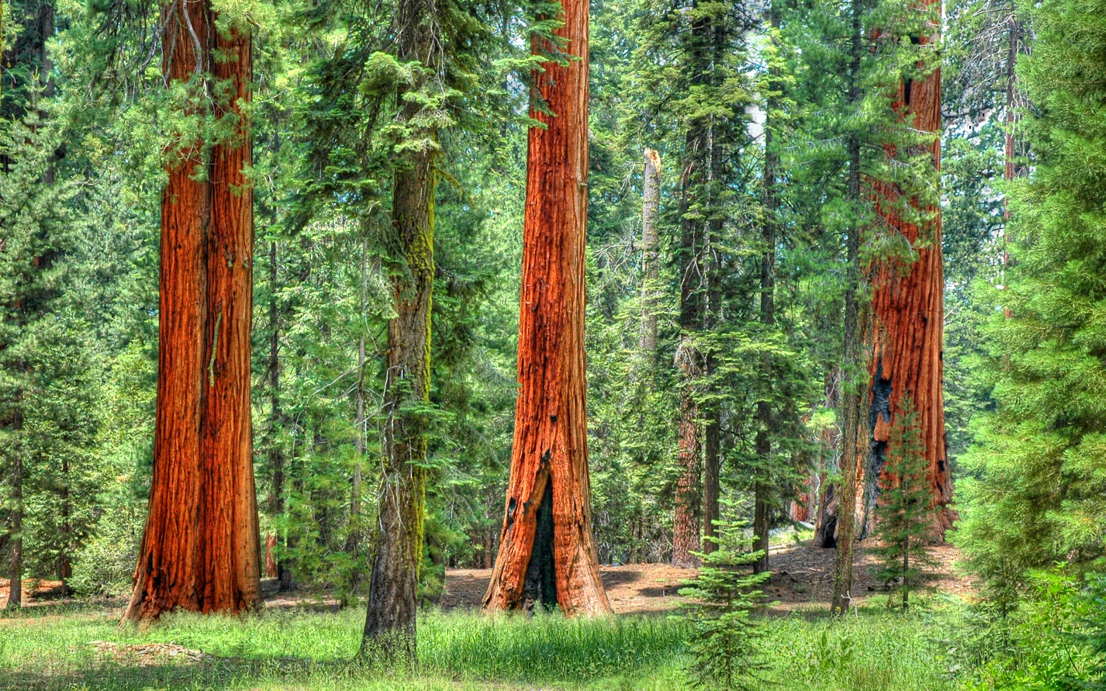 Description: A forest filled with tall trees and green grass covered ground with a forest floor covered in tall trees and green grass.