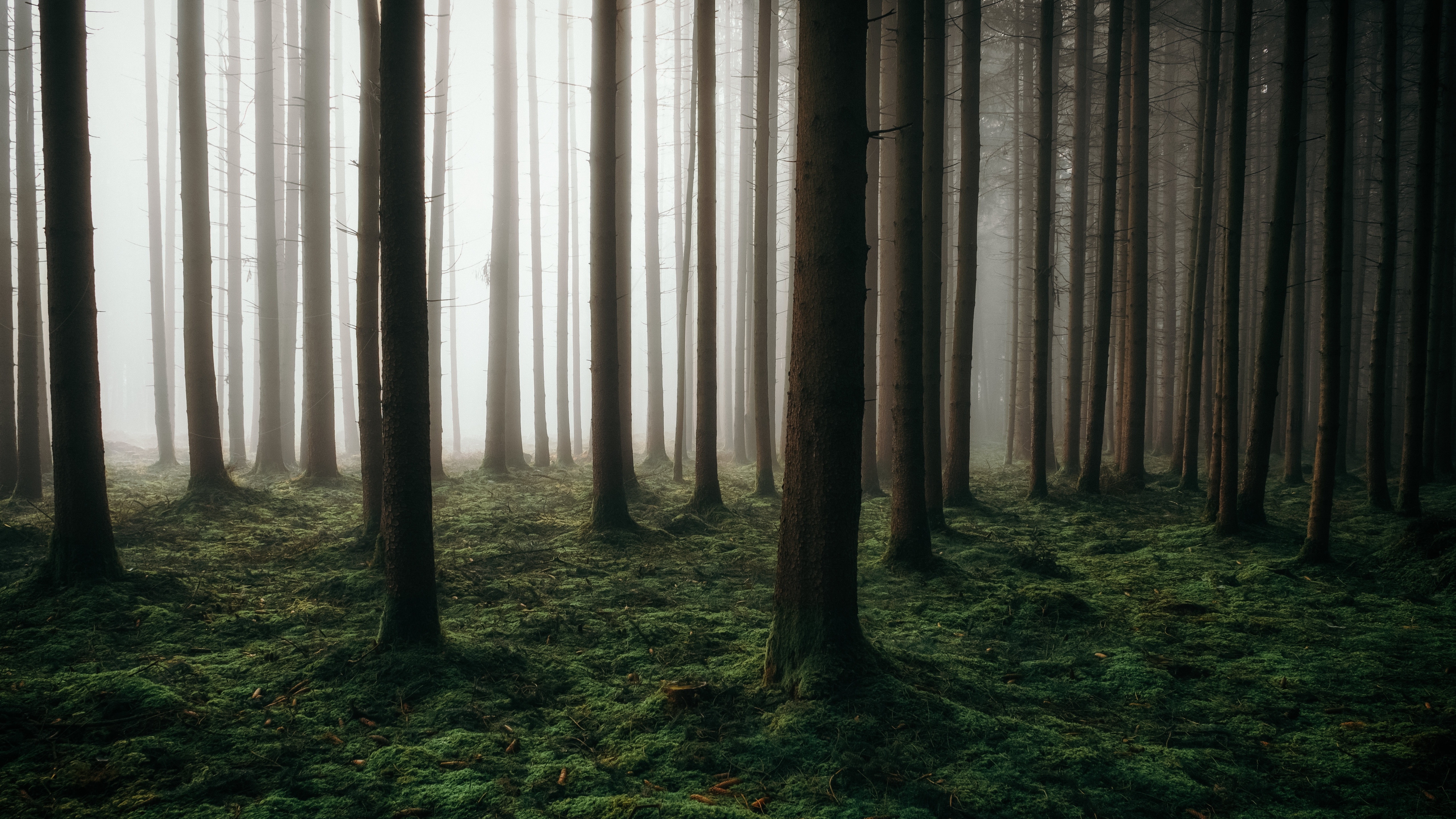 Description: A forest filled with lots of tall trees covered in green grass and foggy skies above it is a forest filled with tall trees and green grass.