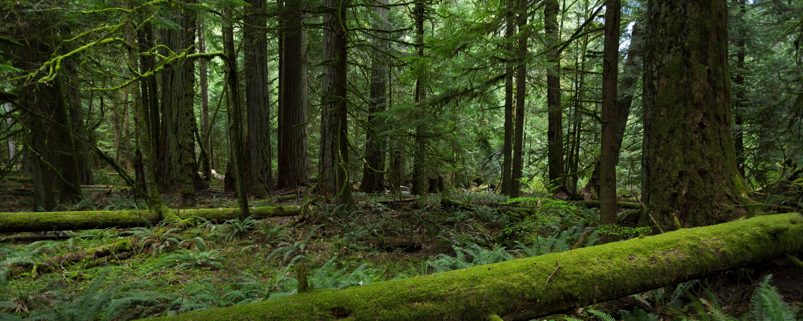 Description: A forest with lots of trees and moss growing on the ground and a fallen log in the foreground.