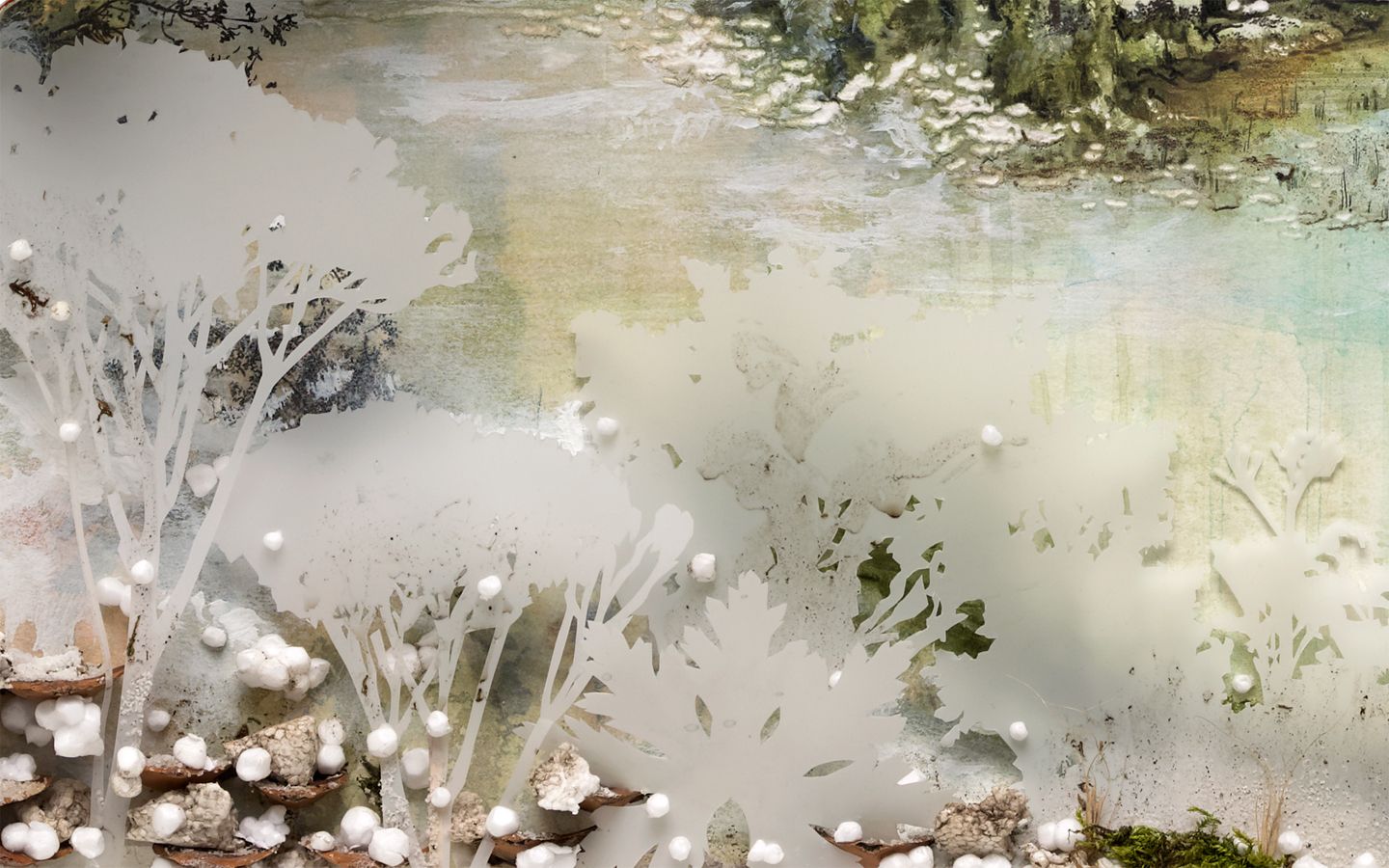 Description: A painting of a forest with white flowers and trees in the background and a blue sky with clouds in the background.