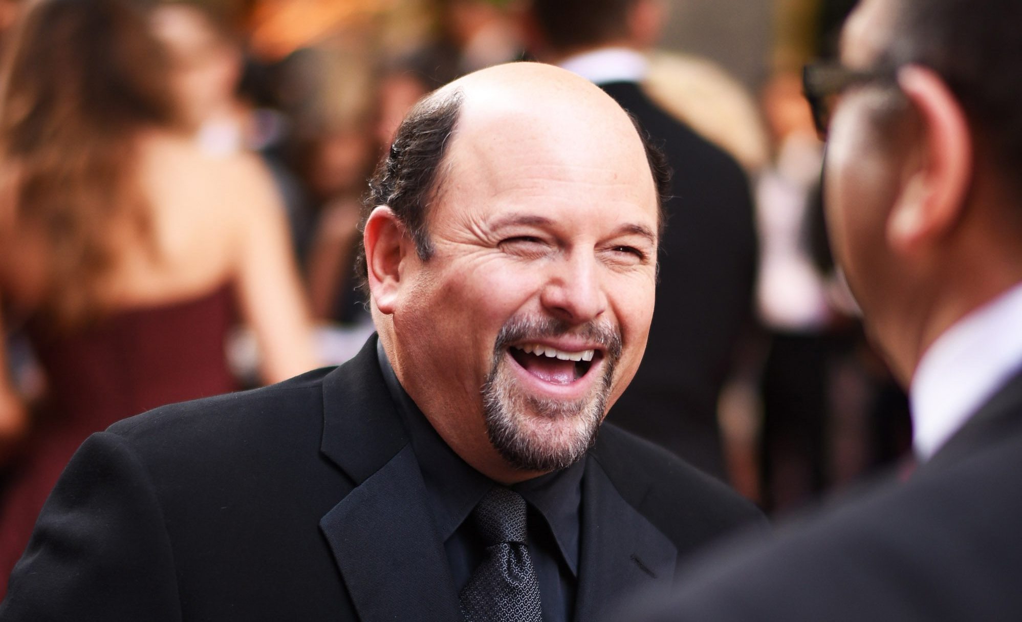 Description: A man in a suit laughing at another man in a suit and tie at a formal event with other people.