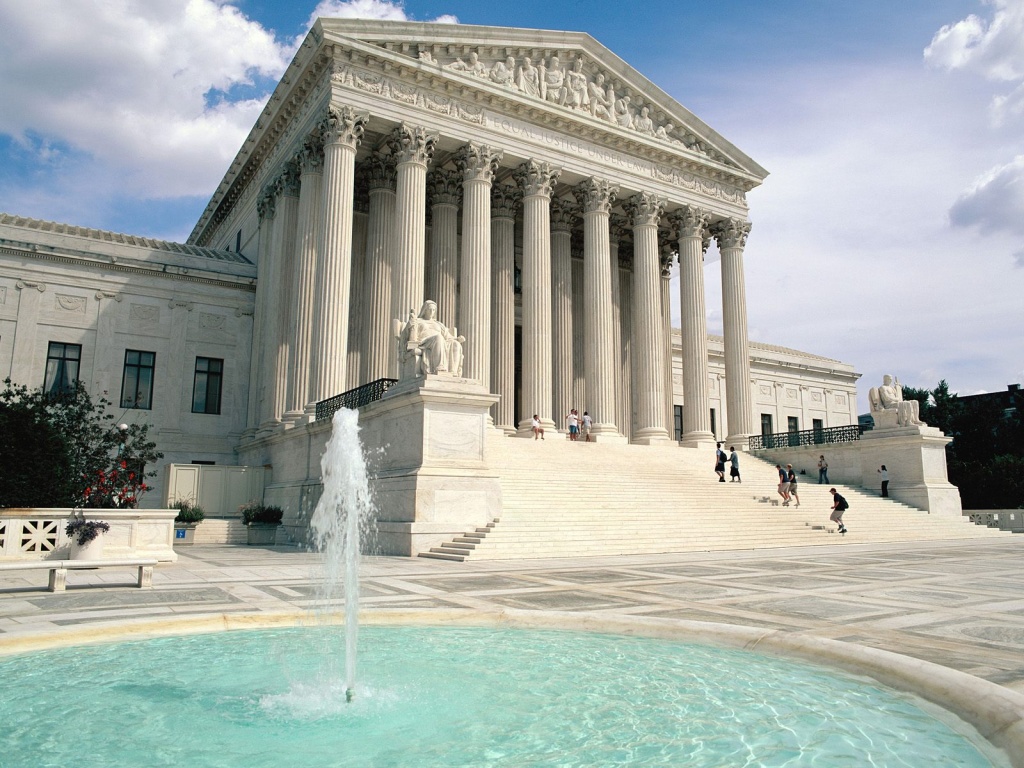Description: A fountain in front of a building with columns and a clock on it's side and people walking around.