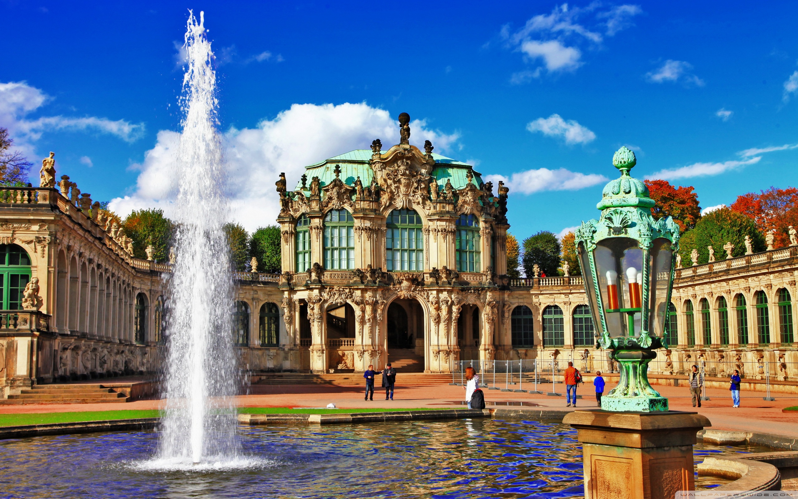 Description: A fountain in front of a building with a fountain in front of it and people walking around it in front of it.