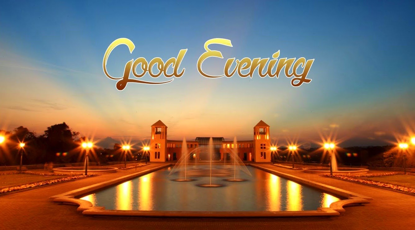 Description: A fountain with a clock tower in the background and the words good evening over it in front of a sunset.