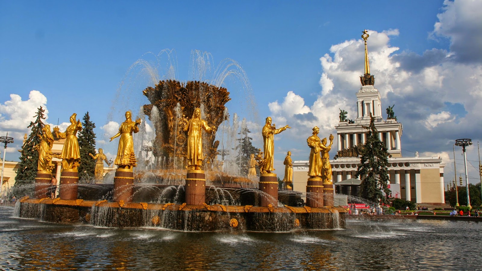 Description: A fountain with golden statues in front of a building and a clock tower in the background with a blue sky.
