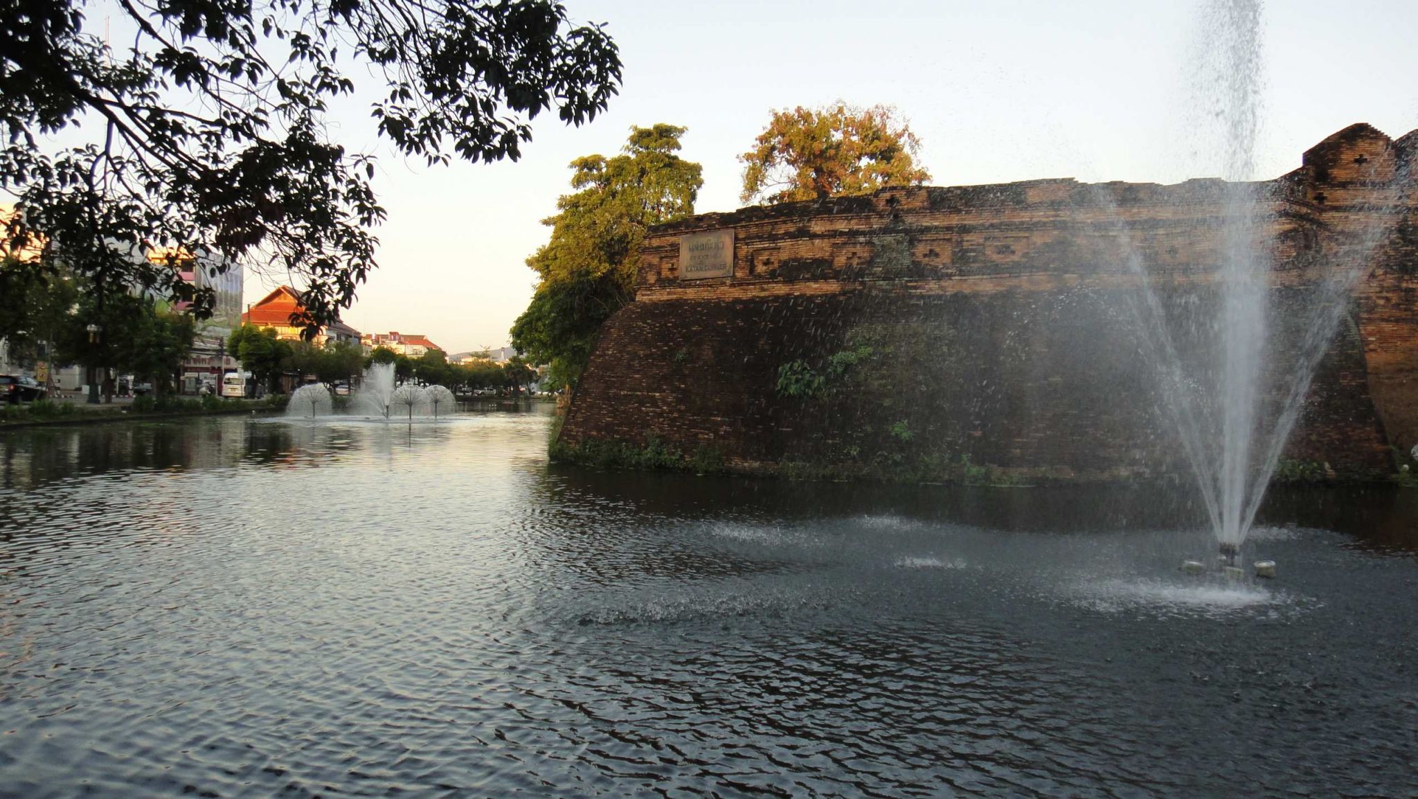 Description: A large fountain spewing water into a lake next to a stone wall and a bridge with a red building.