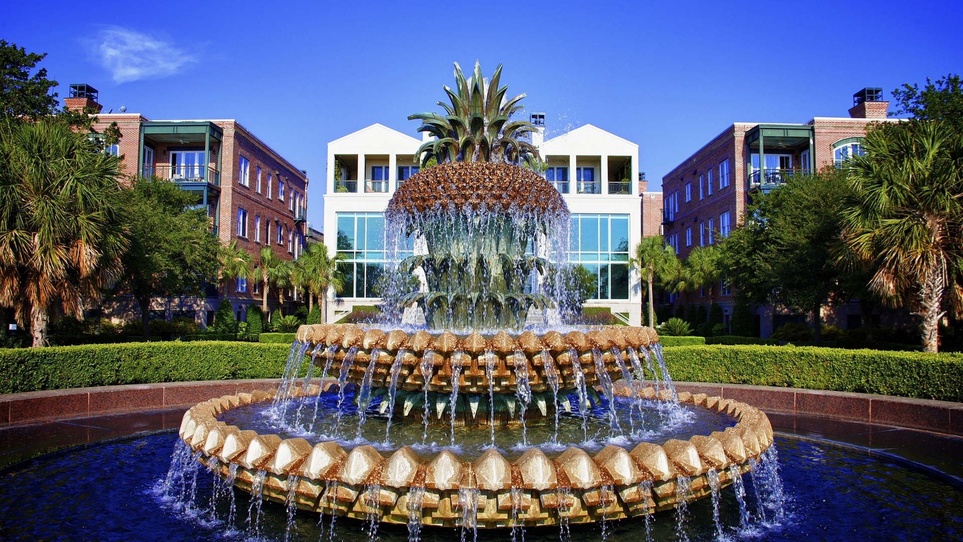 Description: A fountain with a pineapple on top of it in front of a building and trees in the background.