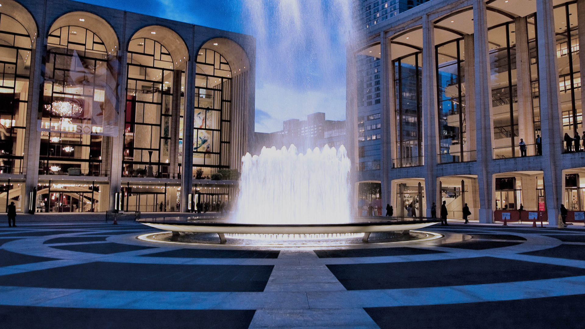 Description: A fountain in a plaza with people walking around it at night time with buildings in the background and a blue sky.