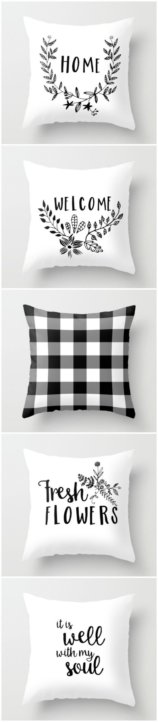 Description: Four pillows with black and white designs on them.