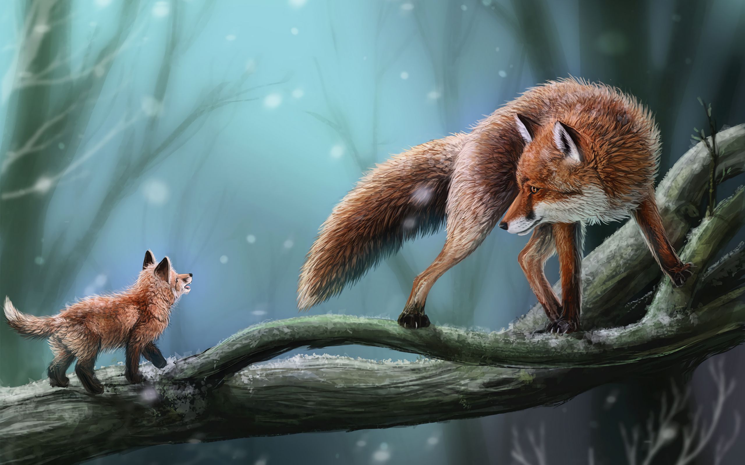 Description: A painting of a fox and its cub on a branch in the snow.