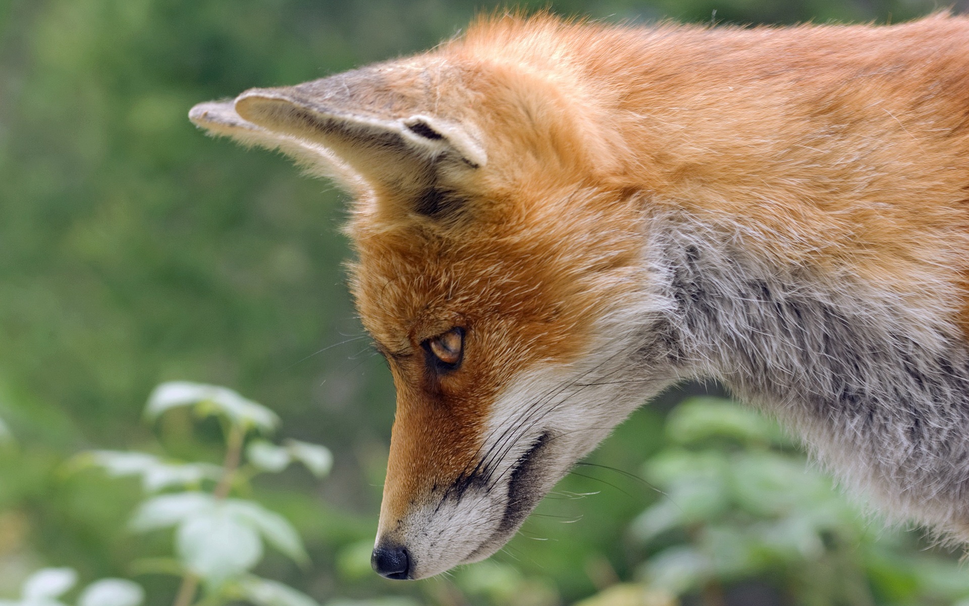 Description: A close up of a fox with a blurry background of trees and bushes in the background.