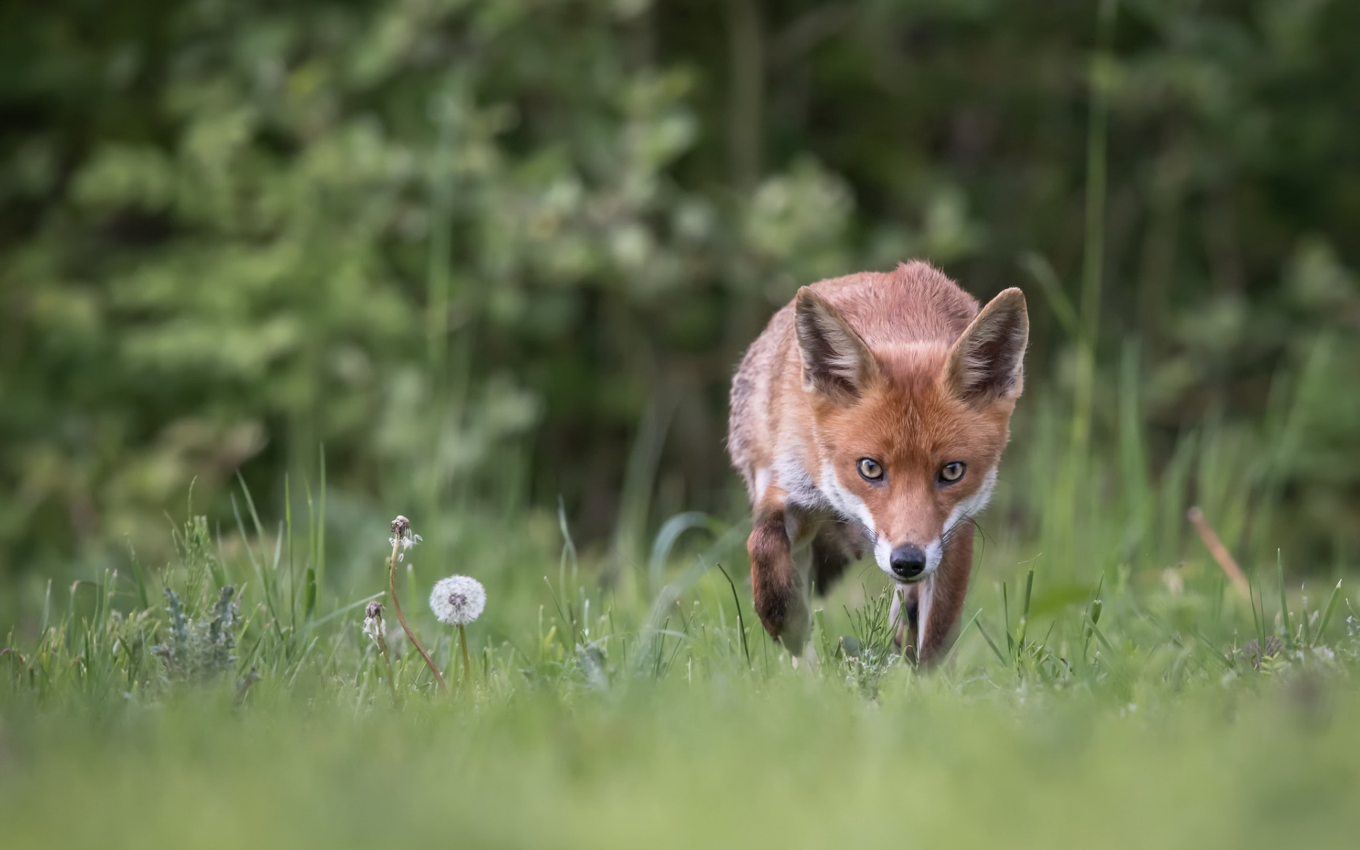Description: A fox is walking through the grass in the woods with a dandelion in its mouth and a dandelion in the foreground.