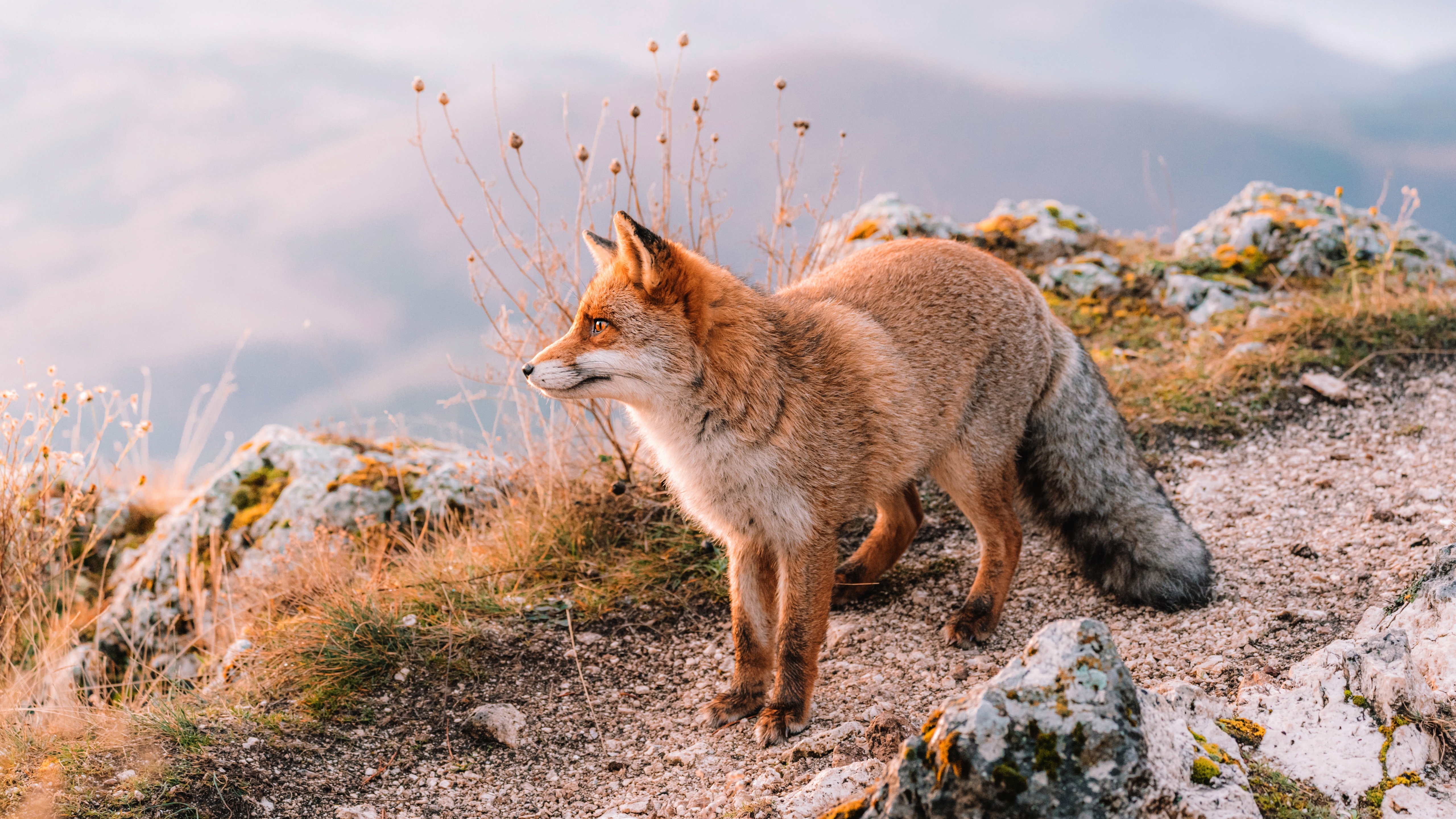 Description: A fox standing on a rocky hillside with a mountain in the background and grass growing on the ground below.