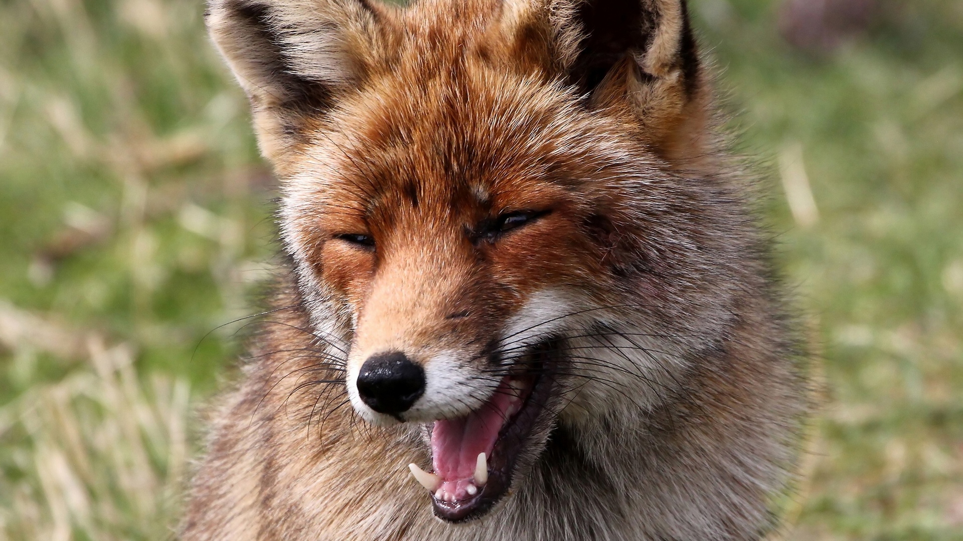 Description: A close up of a fox with its mouth open and it's eyes closed and it's mouth wide open.